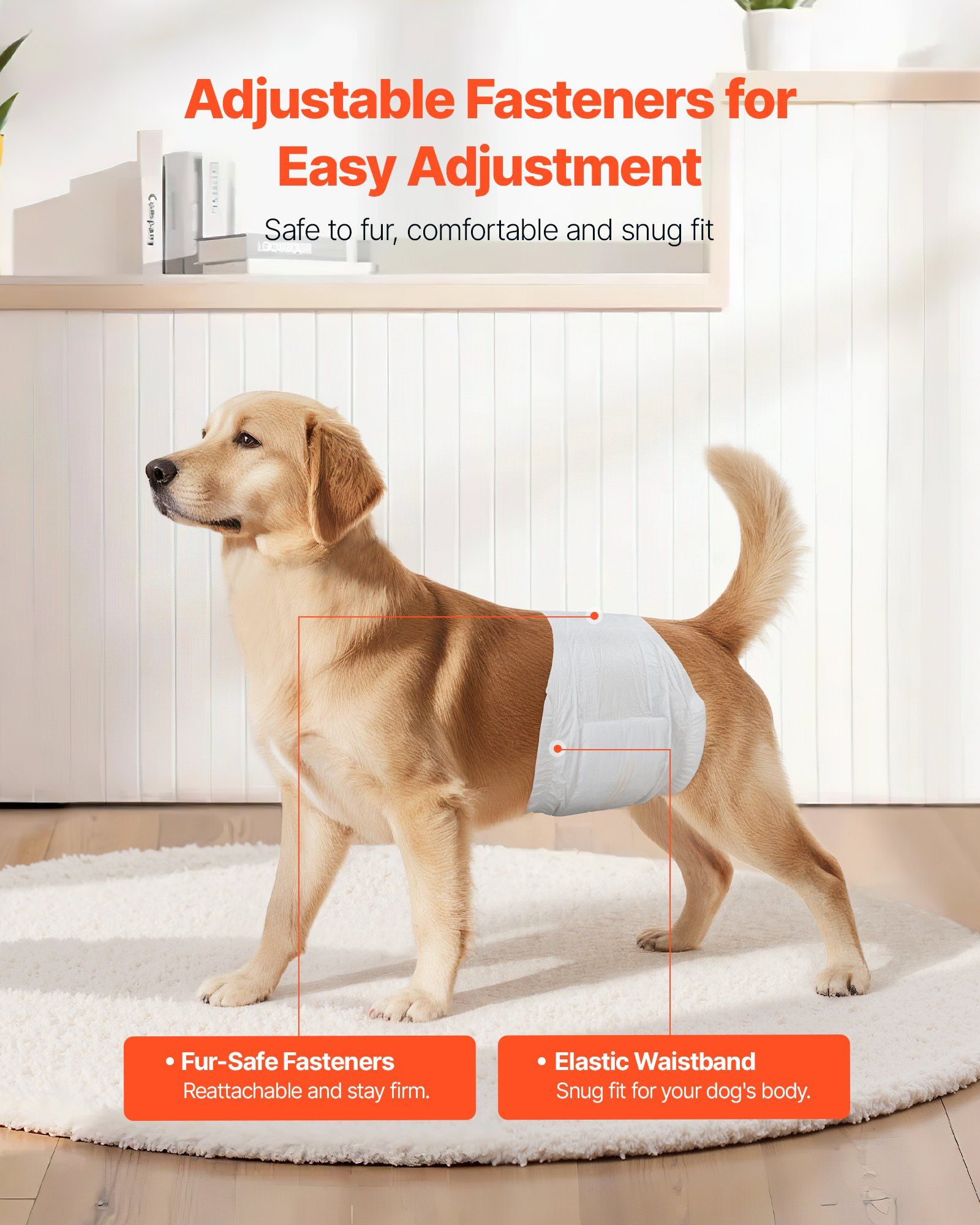 1.Super Absorbent: VEVOR M-sized disposable male dog diapers feature a super absorbent core that quickly locks in liquid, offering 360° leak-proof protection with no backflow. Perfect for dogs in heat cycles, pet training, incontinence, post-surgery recovery, and travel. Suitable Waist Size: 18-25 inches / 45.72 - 63.5 cm