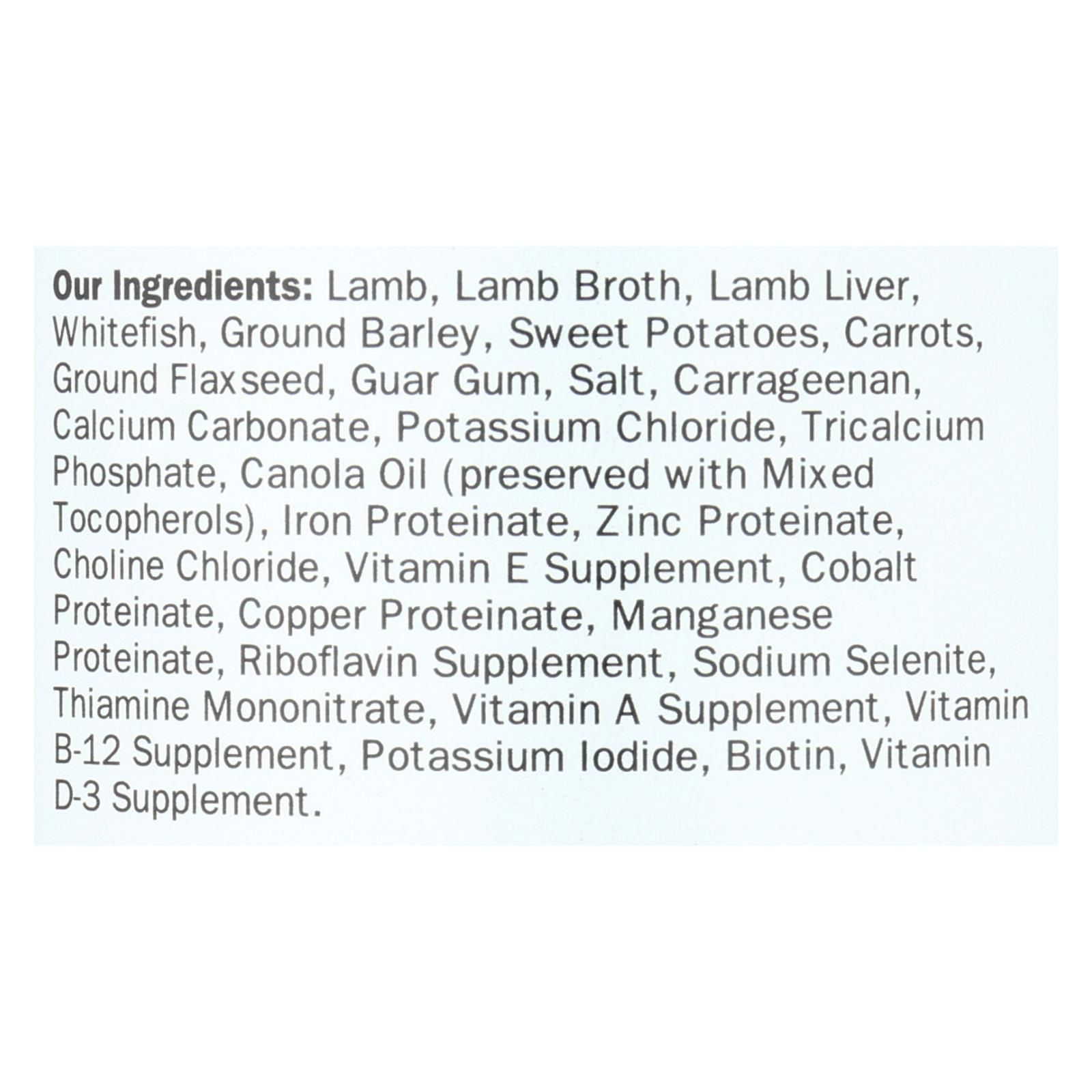ingredients : lamb;lamb broth;lamb liver;whitefish;ground barley;sweet potatoes;carrots;ground flaxseed;guar gum;salt;carrageenan;calcium carbonate;potassium chloride;tricalcium phosphate;canola oil;preserved with mixed tocopherols;iron proteinate;zinc proteinate;choline chloride;vitamin e supplement;cobalt proteinate;copper proteinate;manganese proteinate;riboflavin supplement;sodium selenite;thiamine mononitrate;vitamin a supplement;vitamin b-12 supplement;potassium iodide;biotin;vitamin d-3 supplement